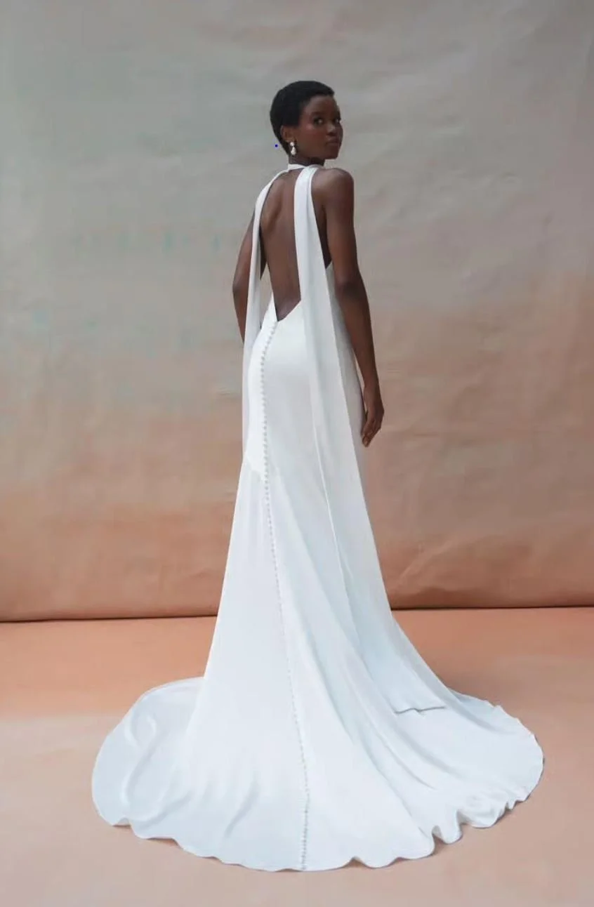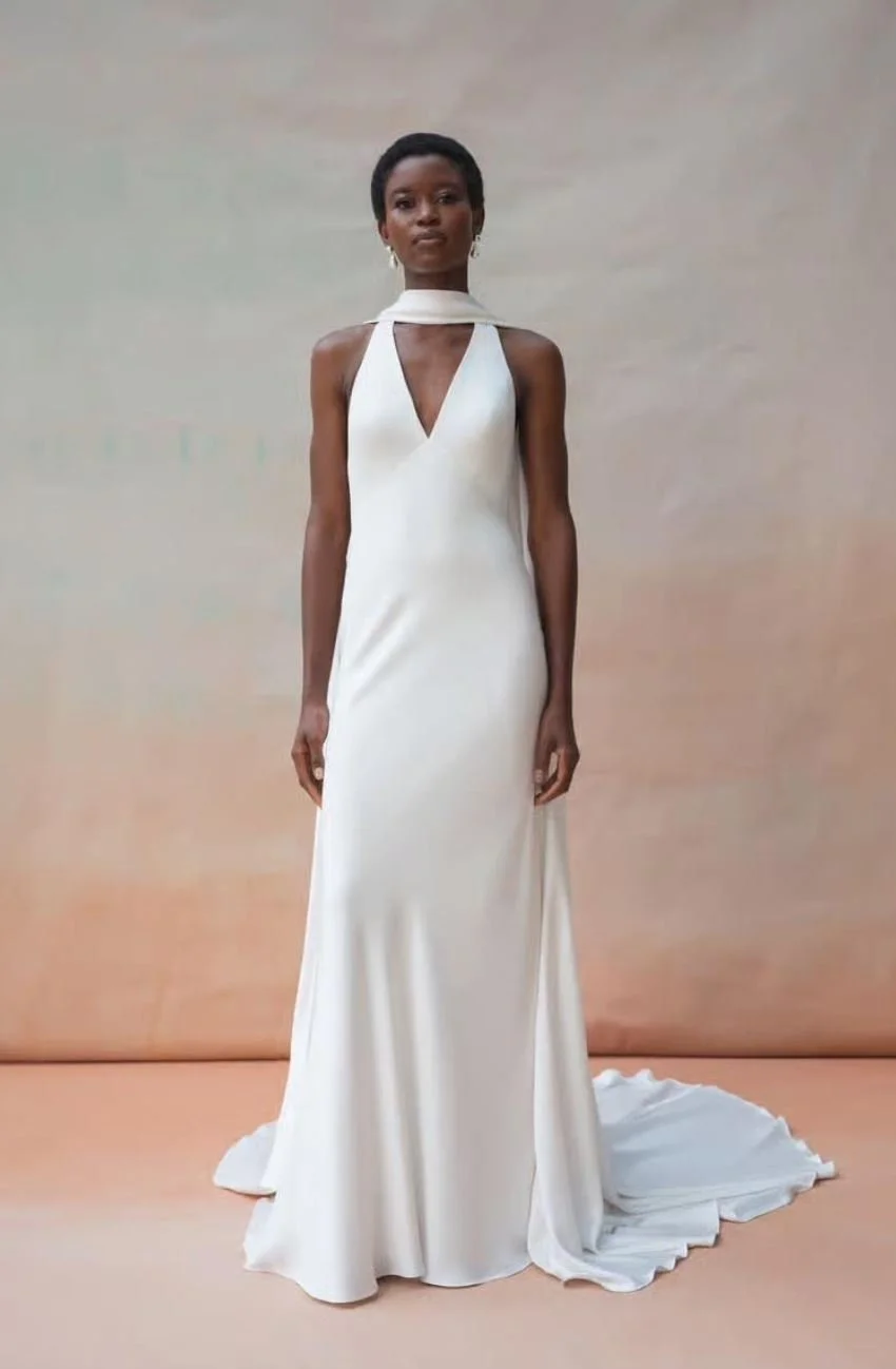 Orenda is a crepe wedding dress with a deep v-plunge and an a-line skirt. Spaghetti straps, 80 inch long train, and pockets. Bodice plunge is secured with nude mesh.