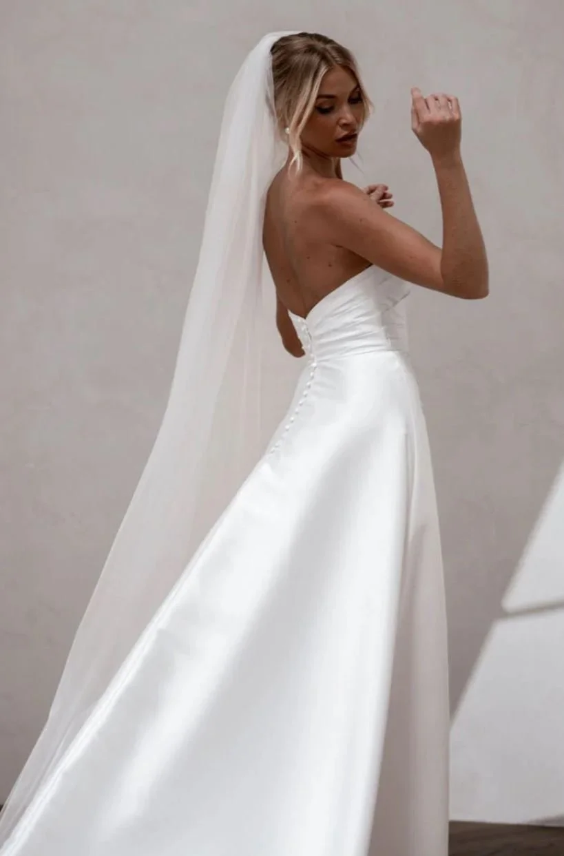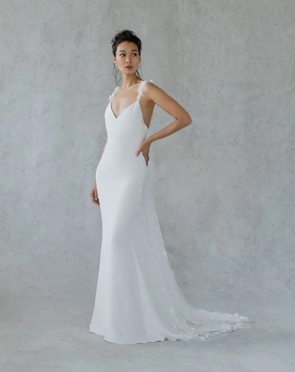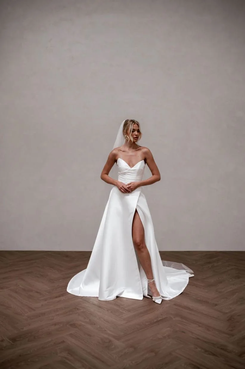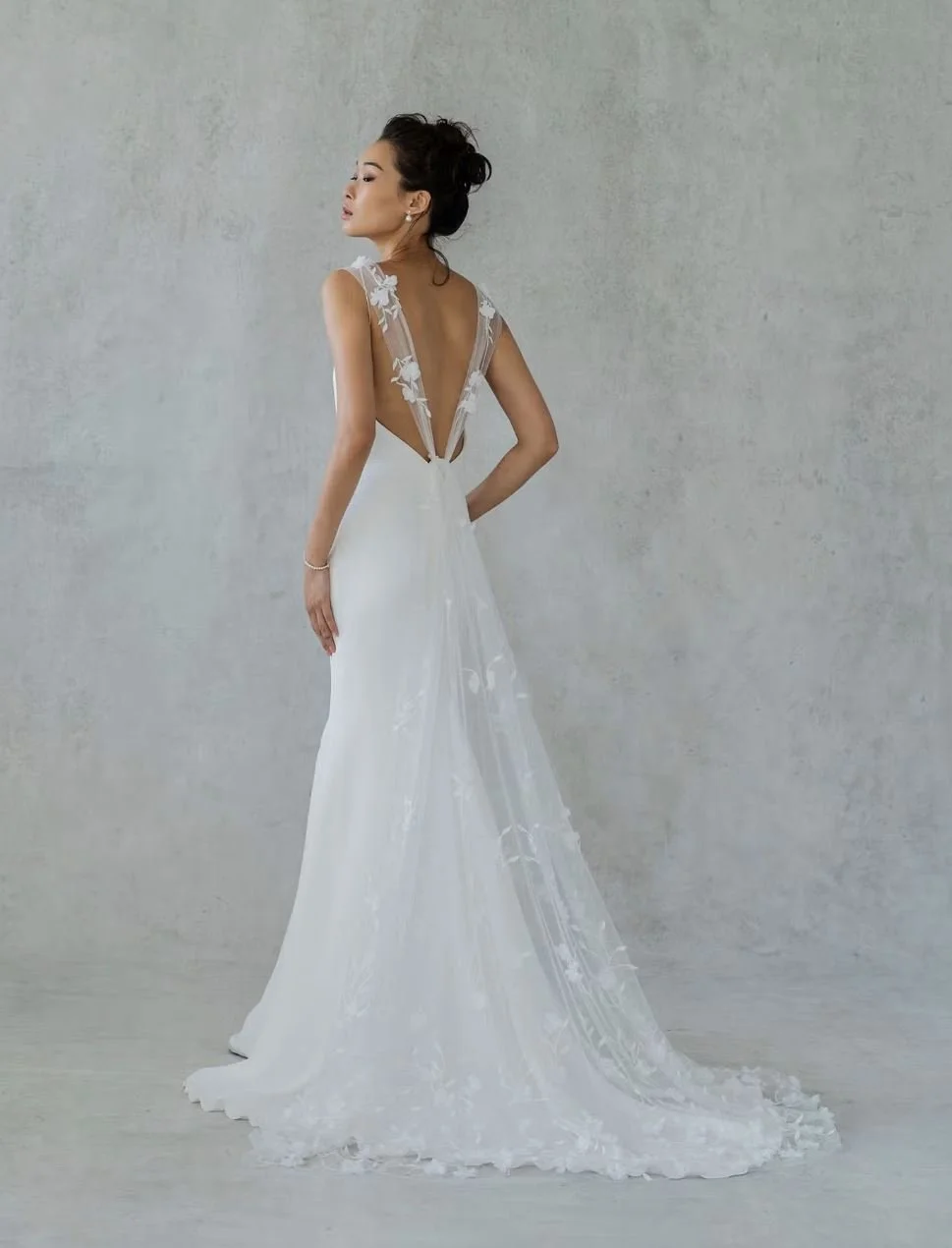 Crafted in Matte Crepe fabric, Watson has more of a modern touch to a timeless look. A sweetheart cowl neckline, fully boned bodice with a sheer illusion back, and seams to give a more dramatic fit and flare skirt. Watson is a modern classic.