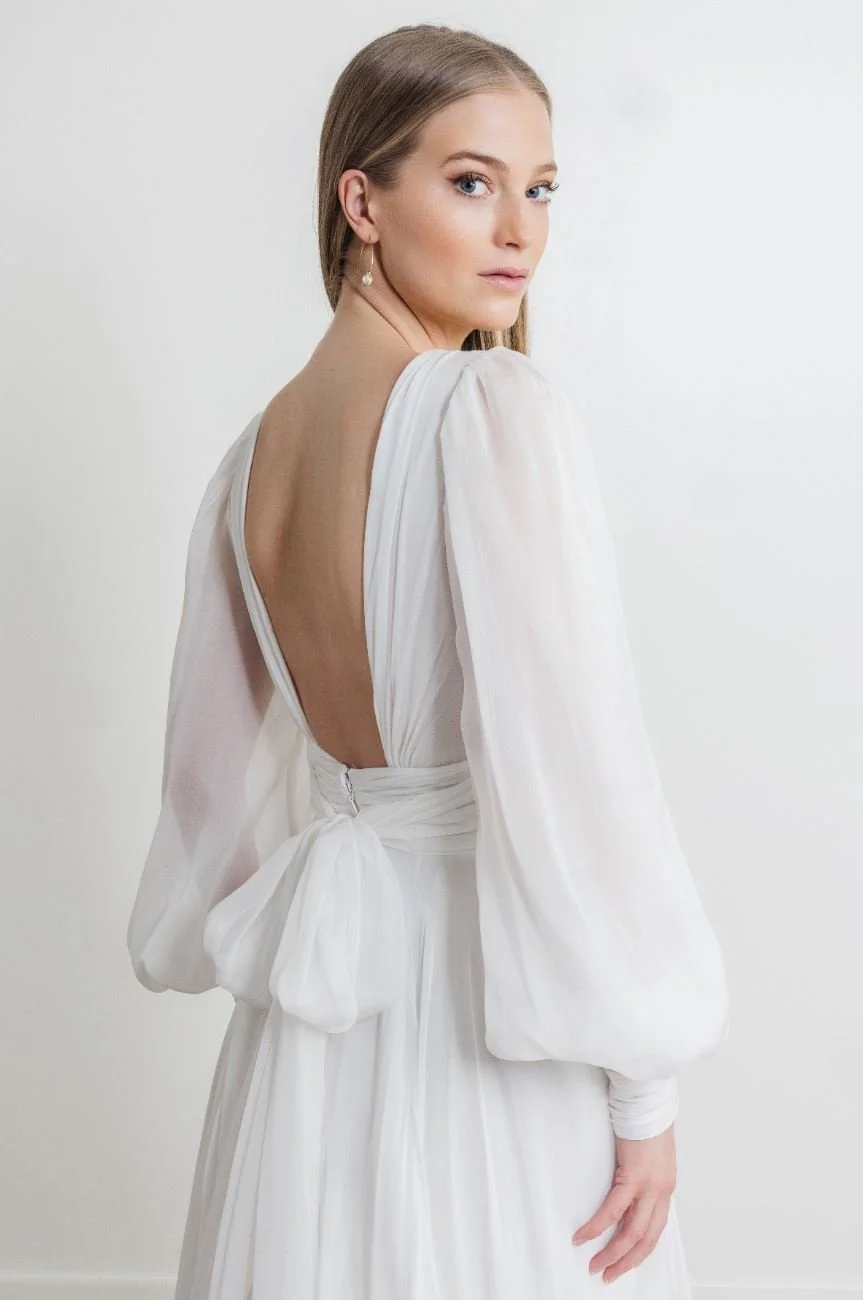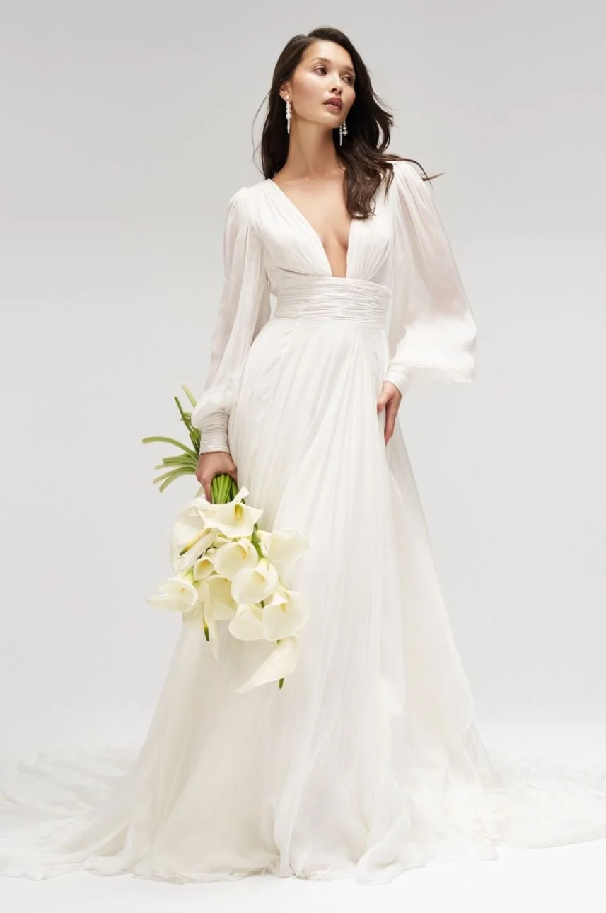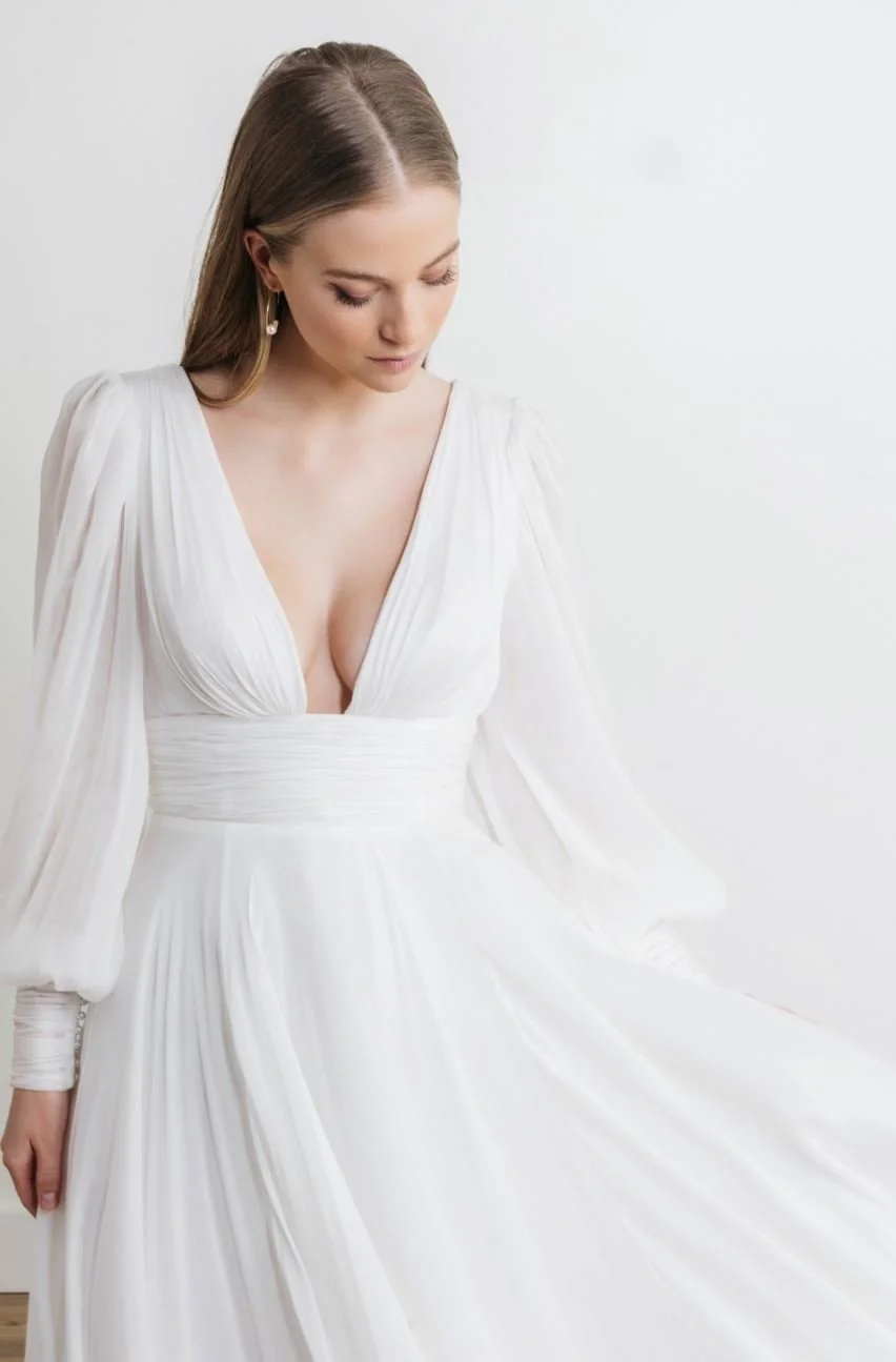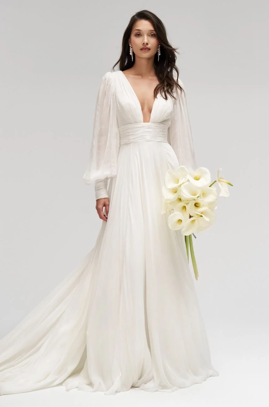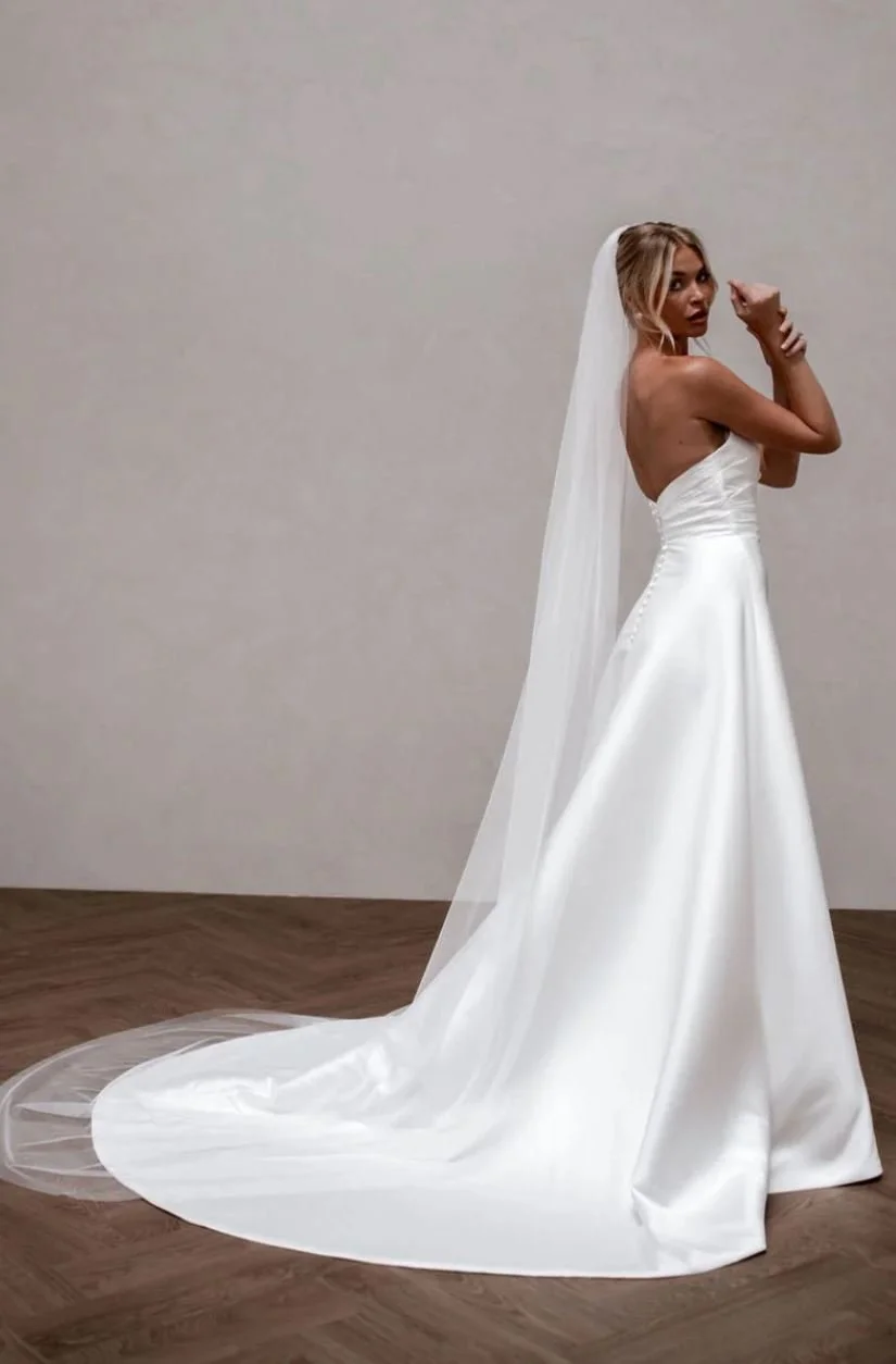 Crafted in Matte Crepe fabric, Watson has more of a modern touch to a timeless look. A sweetheart cowl neckline, fully boned bodice with a sheer illusion back, and seams to give a more dramatic fit and flare skirt. Watson is a modern classic.